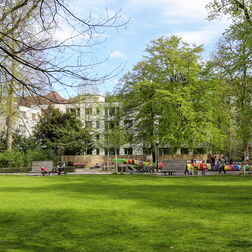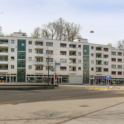 Die gekrümmte Zeile steht zwischen der lauten Rorschacher Strasse und dem ruhigen Stadtpark. Sie bietet einen Mix von Läden und Wohnungen mit 1 bis 4,5 Zimmern. Im 1942 gekauften Haus Nummer 45 wuchs der Flugpionier, Luftbildfotograf und Swissair-Gründer Walter Mittelholzer auf, dessen Eltern hier eine Bäckerei betrieben. 1965/1966 ersetzte die Genossenschaft zum Korn die fünf Altbauten durch die von Architekt Fritz Harms entworfene Wohn- und Geschäftsüberbauung. Die Idee eines Volkshauses konnte nicht realisiert werden, da der Volkshausgenossenschaft St. Gallen die nötigen Mittel fehlten. Bis 1999 befand sich in Nummer 45 das VHTL-Regionalsekretariat.